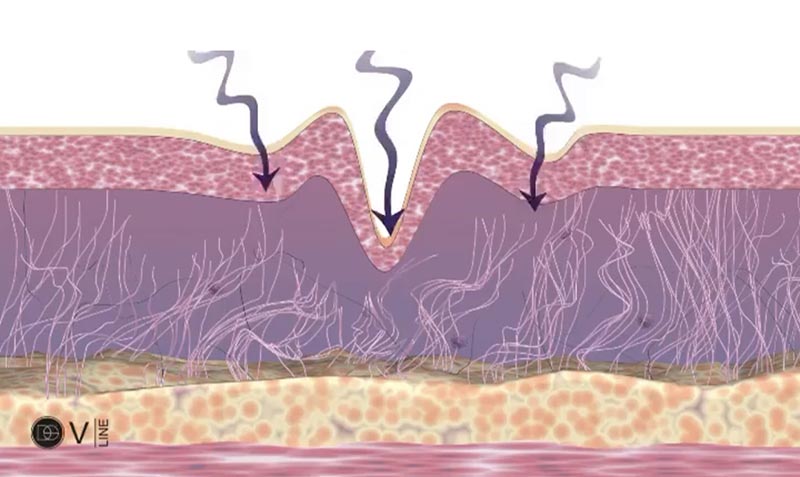 Wanneer je kiest voor een DSV-line collageenbehandeling, wordt er na een intensieve reiniging gestart met een microneedling behandeling en diepe bindweefselgrepen. Microscopisch kleine gaatjes, gecombineerd met een werkstofampul prepareren de huid op de collageendraden. Het restant van de werkstofampul wordt met stevige, diepe bindweefselgrepen weggemasseerd. De huid is nu klaar om het all-over collageenmasker op te nemen. Door de warmte van de huid en de werkstoffen, is het mogelijk van macro-draadjes een micro-opname te bewerkstelligen.
